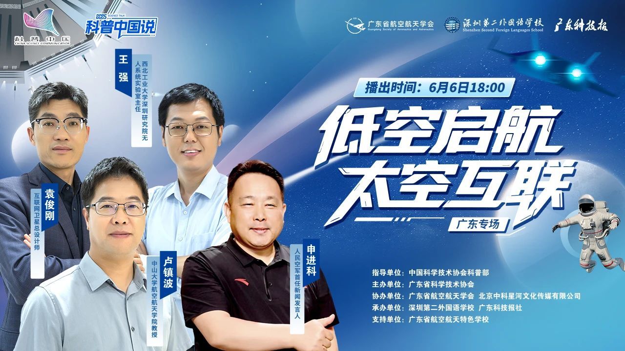 6月6日18时,由中国科学技术协会科普部指导,广东省科学技术协会主办,广东省航空航天学会和北京中科星河文化传媒有限公司协办,深圳第二外国语学校和广东科技报社承办,广东省航空航天特色学校支持的“科普中国说”广东专场活动在科普中国、广东科普、广东科技报视频号及南方日报、触电新闻等平台准时开播,约306万网友在线观看。